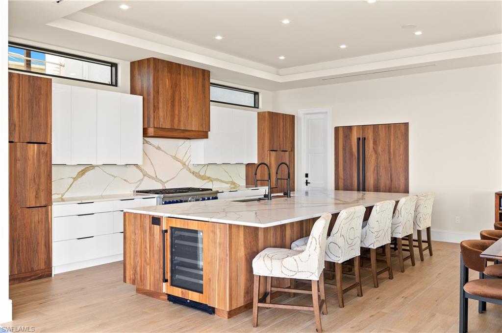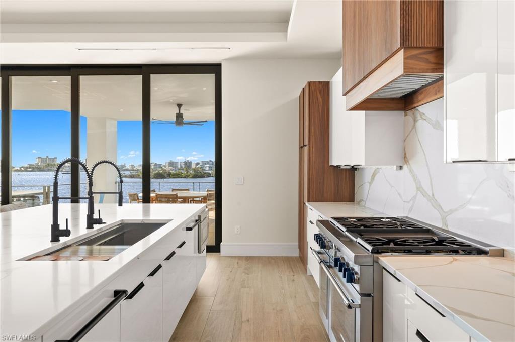 The kitchen is the soul of it all. Mid-century esque meets modern, a space begging for simple ingredients, good knives, and better company. From here, you can watch the world wander by on the water while you stir, chop, taste, and exist--exactly as you are. From the terrace, the view opens in soft, deliberate layers--first across untouched Grayson Island and its protected bird sanctuary, then out toward the distant shimmer of Fort Myers Beach's skyline, with the Sanibel Causeway stretching quietly along the eastern edge of the horizon.
